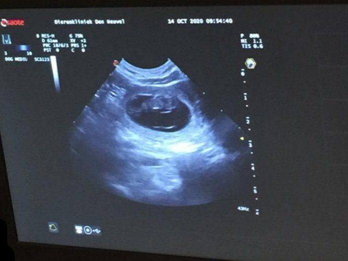 1. Ultraschall, 27 Tage nach der Deckung. Es wurden 5-6 Welpen gesichtet.
