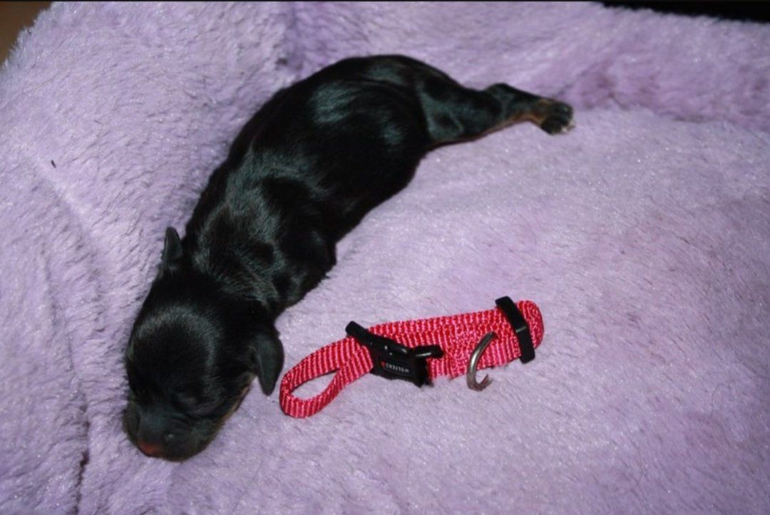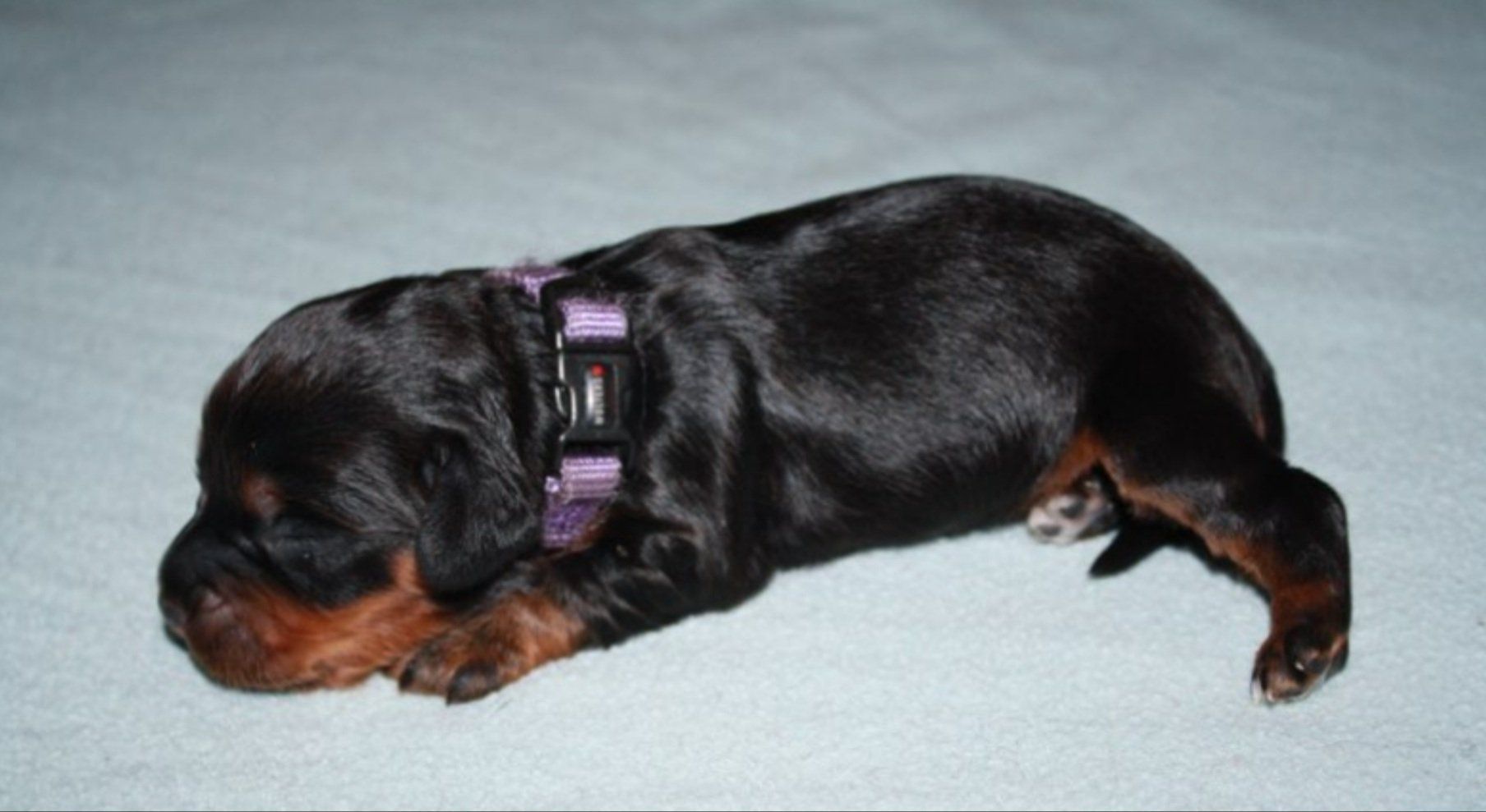 Eine Hündin (lila), black-tan, mit einem kleinen weißen Fleck auf der Brust.