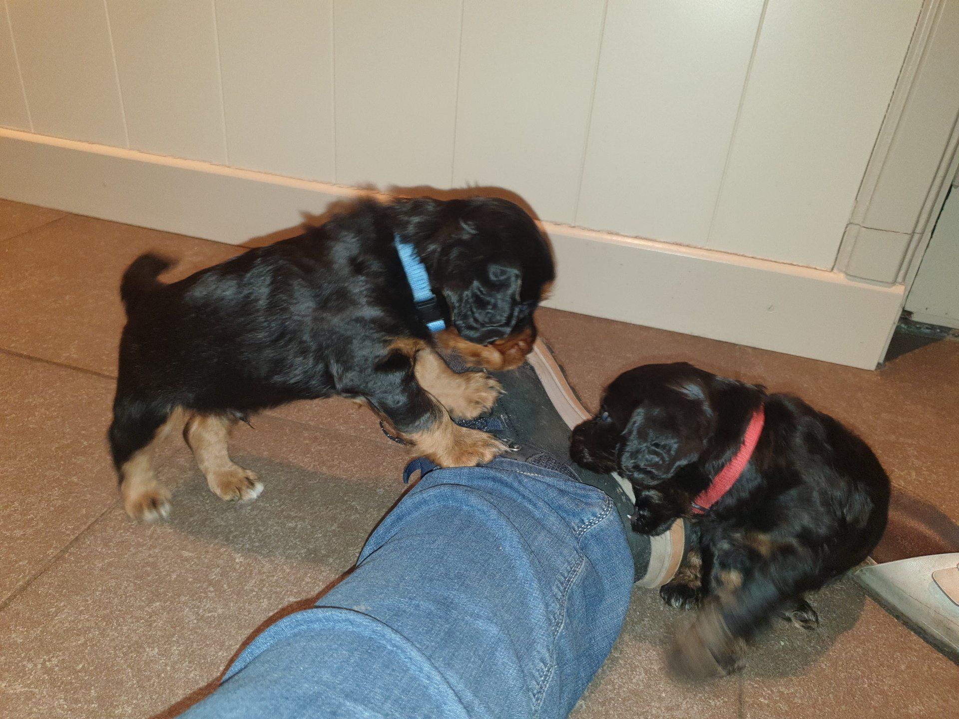 Die Welpen sind nun 3 1/2 Wochen alt. So langsam entdecken sie die Welt und spielen schon miteinander.