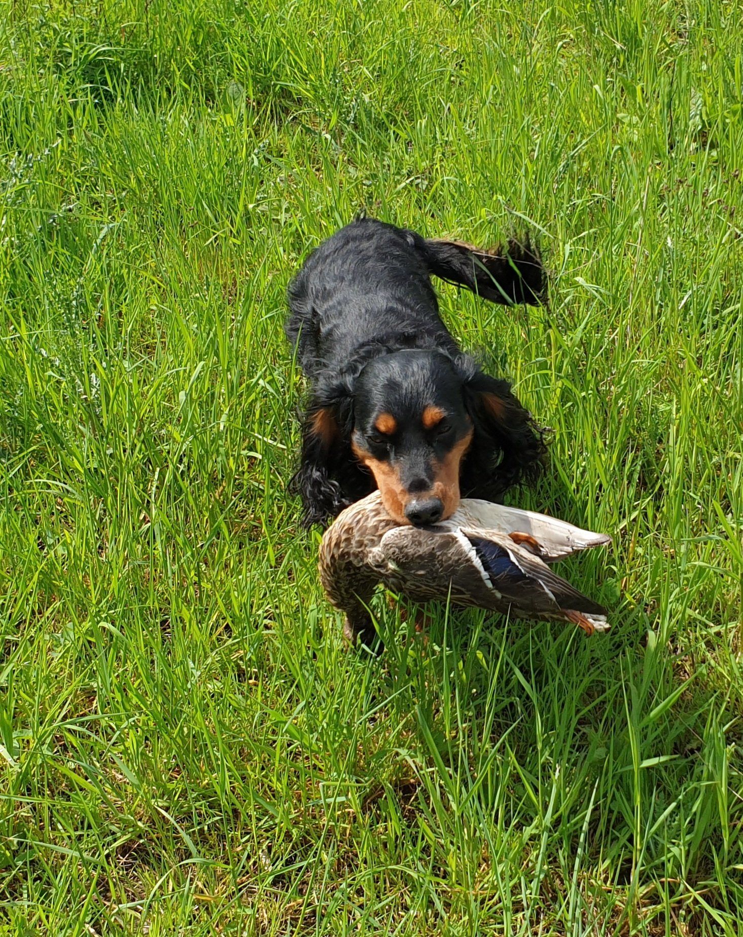 Bantu beim Apportieren im schwierigen Gelände. Von Brennesseln, Disteln und Dornen war alles dabei. Heute haben wir mit einer Ente gearbeitet.