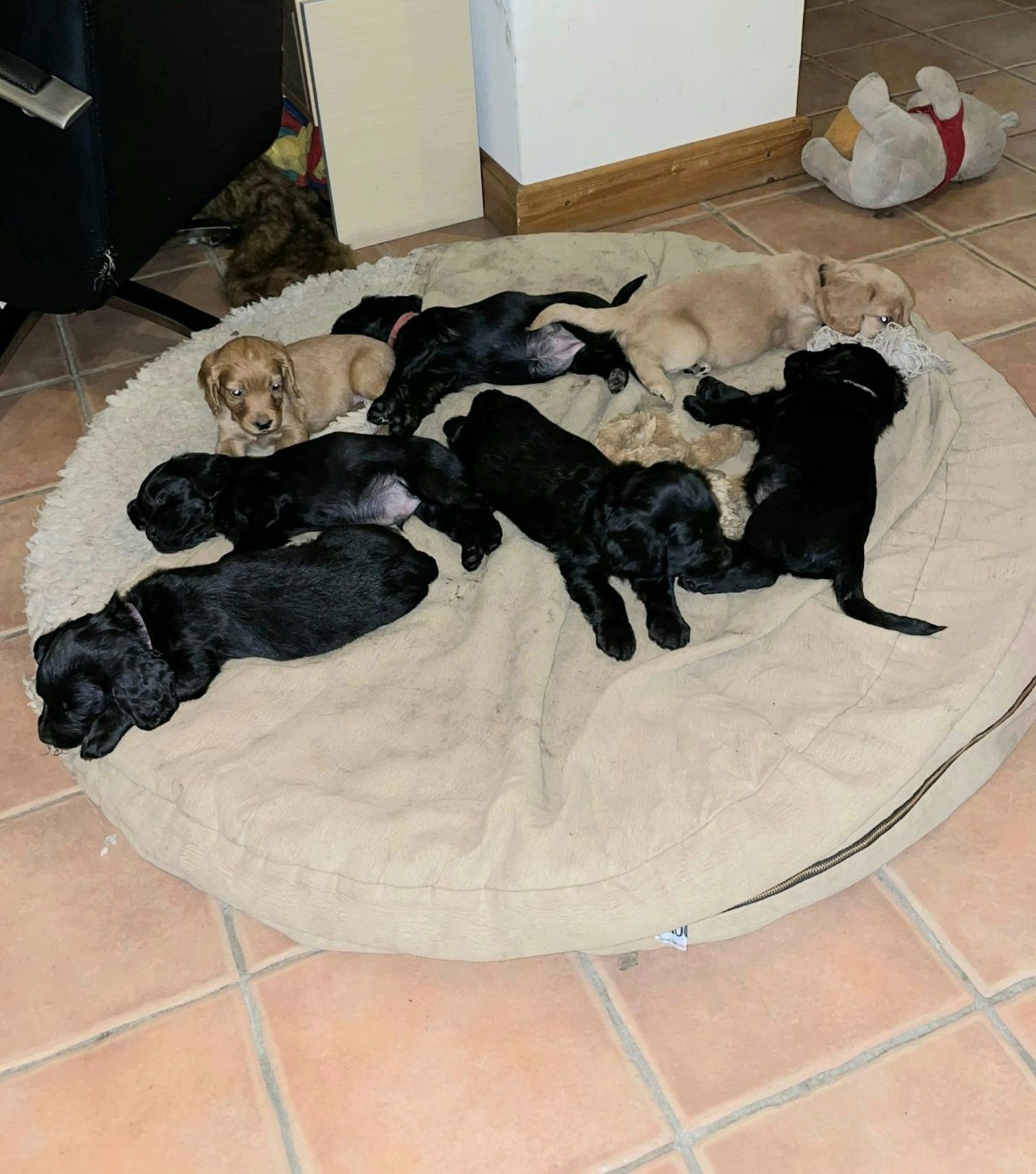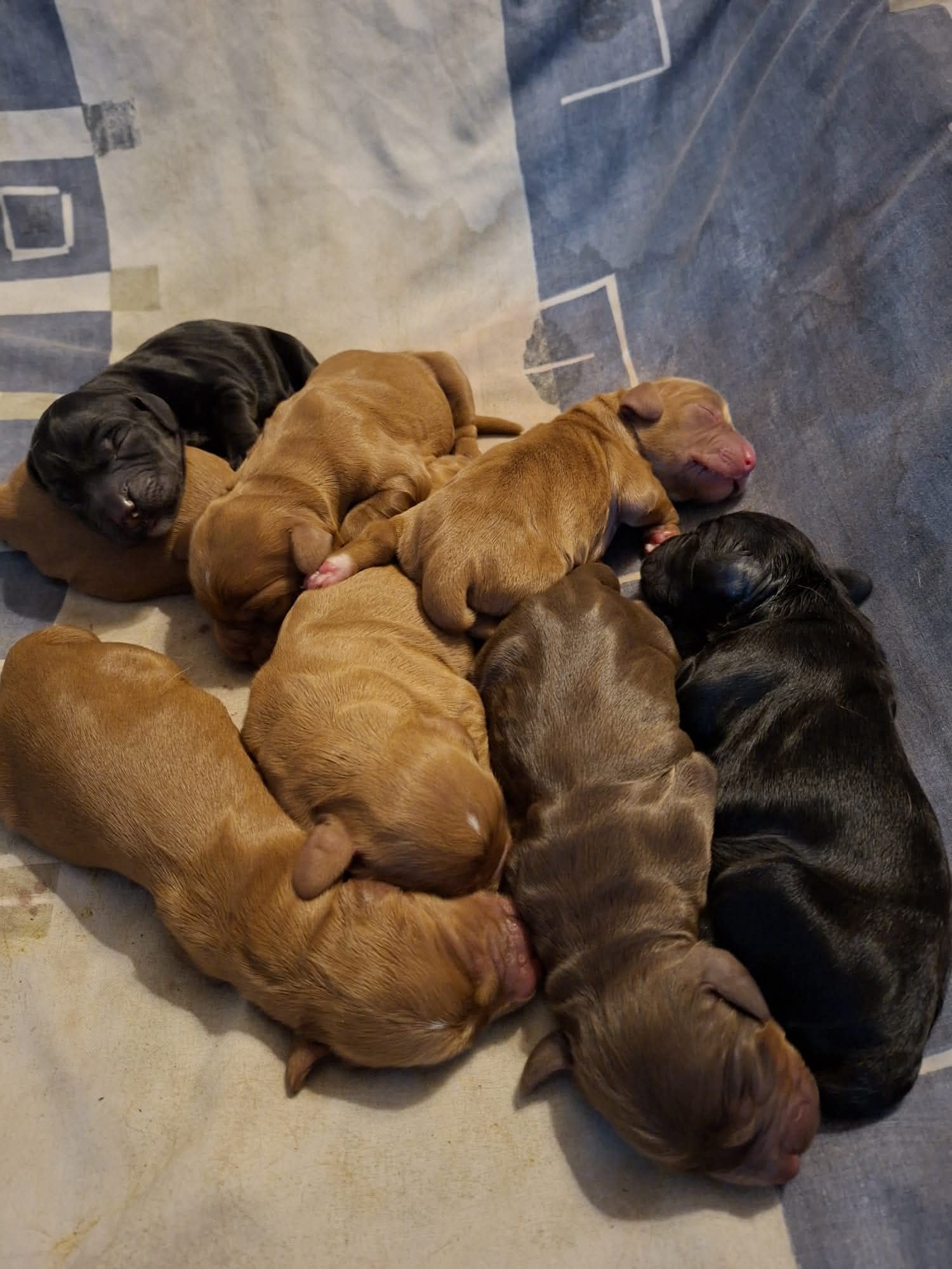 4 black Hündinnen, 2 black, 1 tan und 1 lemonfarbener Rüde.