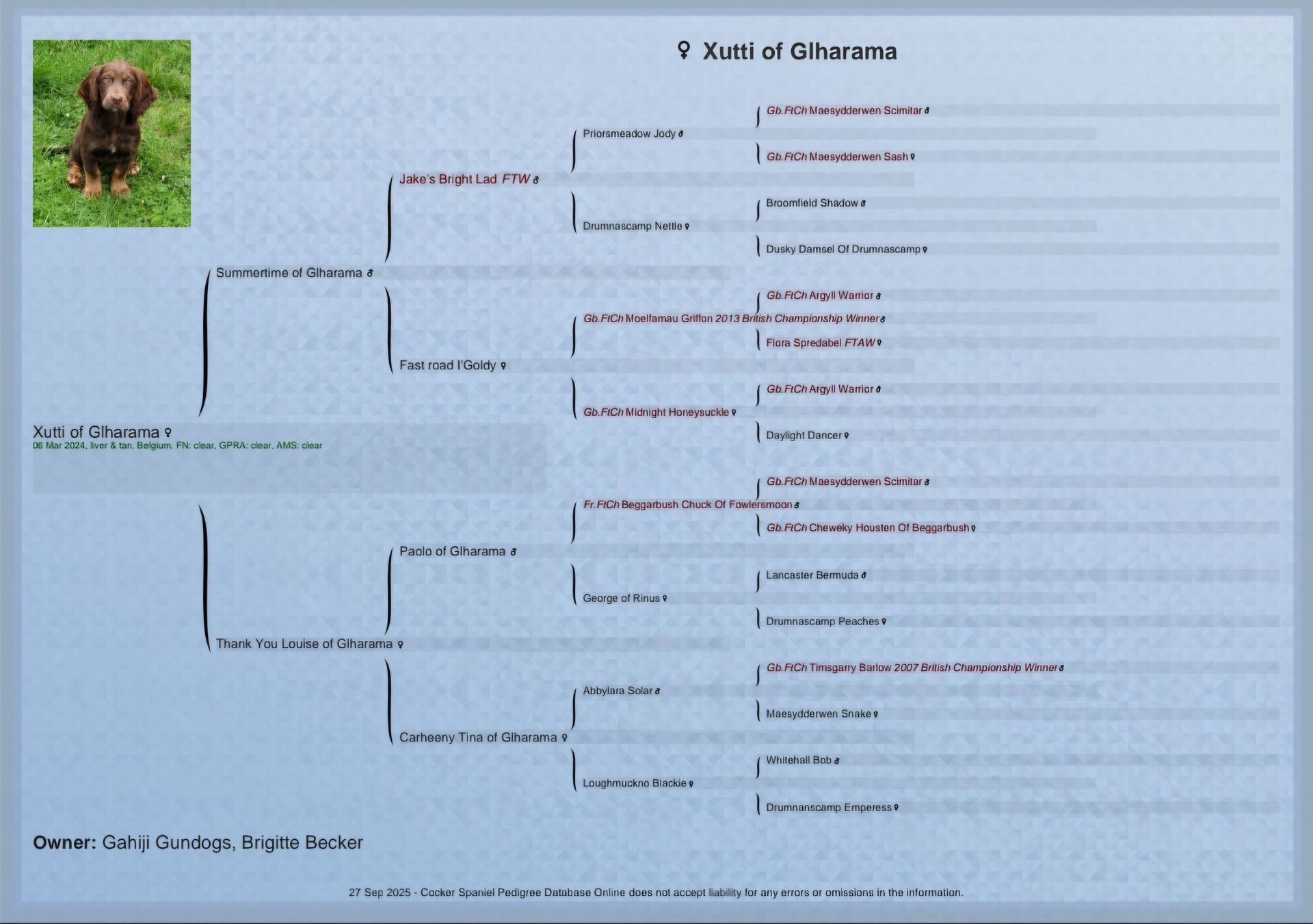 Viele ihrer Vorfahren; Großeltern, sowie Ur- und Ur-Ur- Großeltern waren FtCh + FTW (Fieldtrail Champions + Fieldtrail Winner)